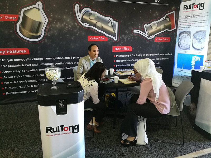 在展会期间,西安瑞通的CFS射孔技术引起哈里伯顿(Halliburton)、斯伦贝谢(Schlumberger)、贝克休斯(BakeHughes)、威德福(Weatherford)等世界排名前列的油服公司巨头前来参展的射孔高级管理人员和工程师们的浓厚兴趣。其中,有公司的工程师和射孔方面的高级管理人员,多次来西安瑞通的展位交流CFS射孔技术以及探讨CFS技术与现存的射孔技术之间的差异。在与其交流的过程中,我们可以更加坚信西安瑞通的CFS射孔技术达到了“国际首创、国际领先“的水平,是射孔技术的“革命”。